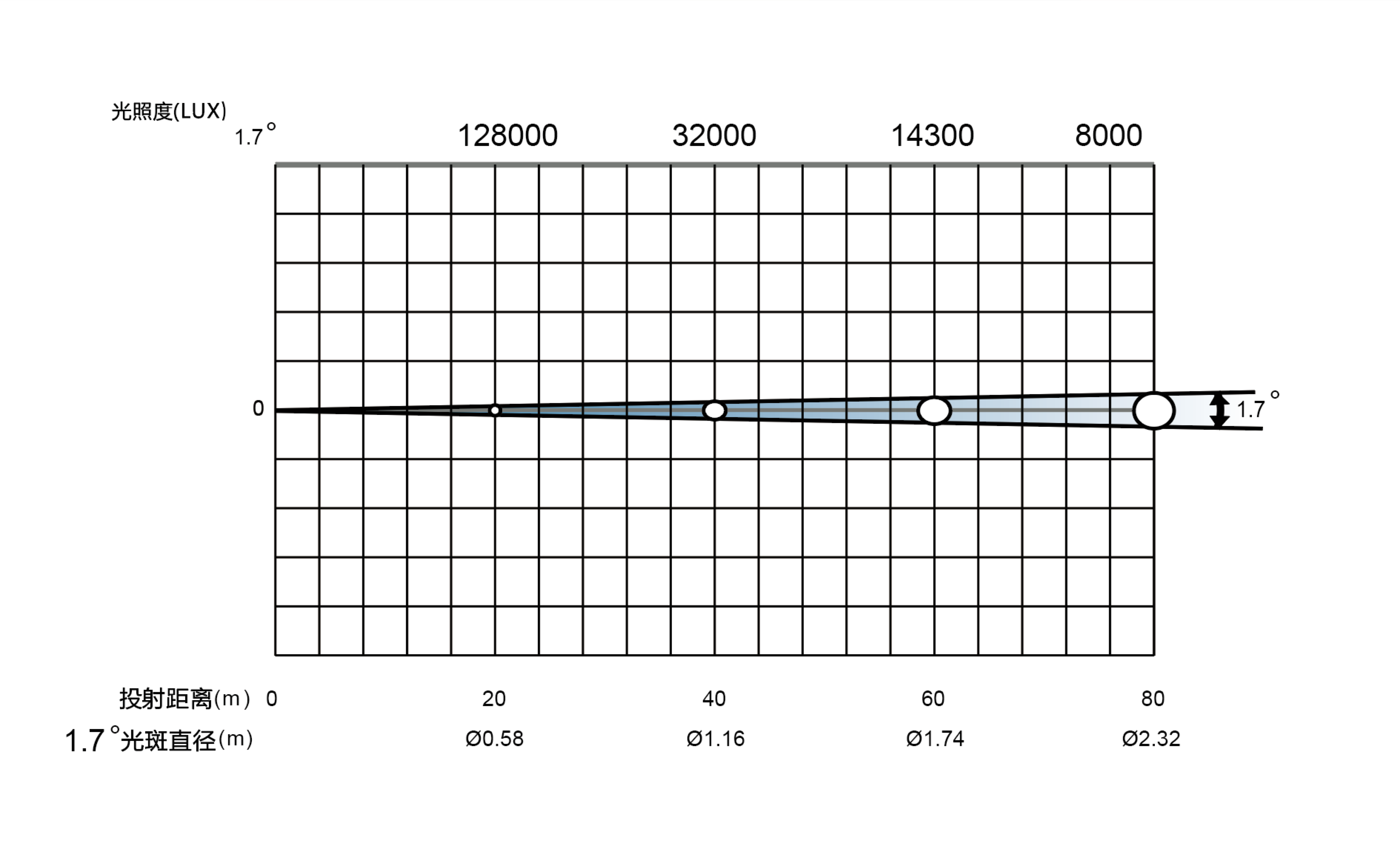 射距,光斑直徑與照度: