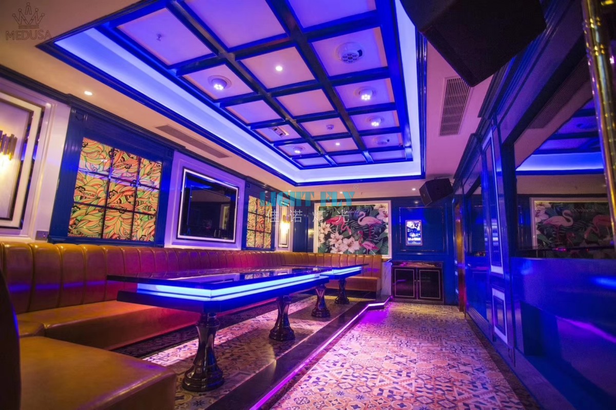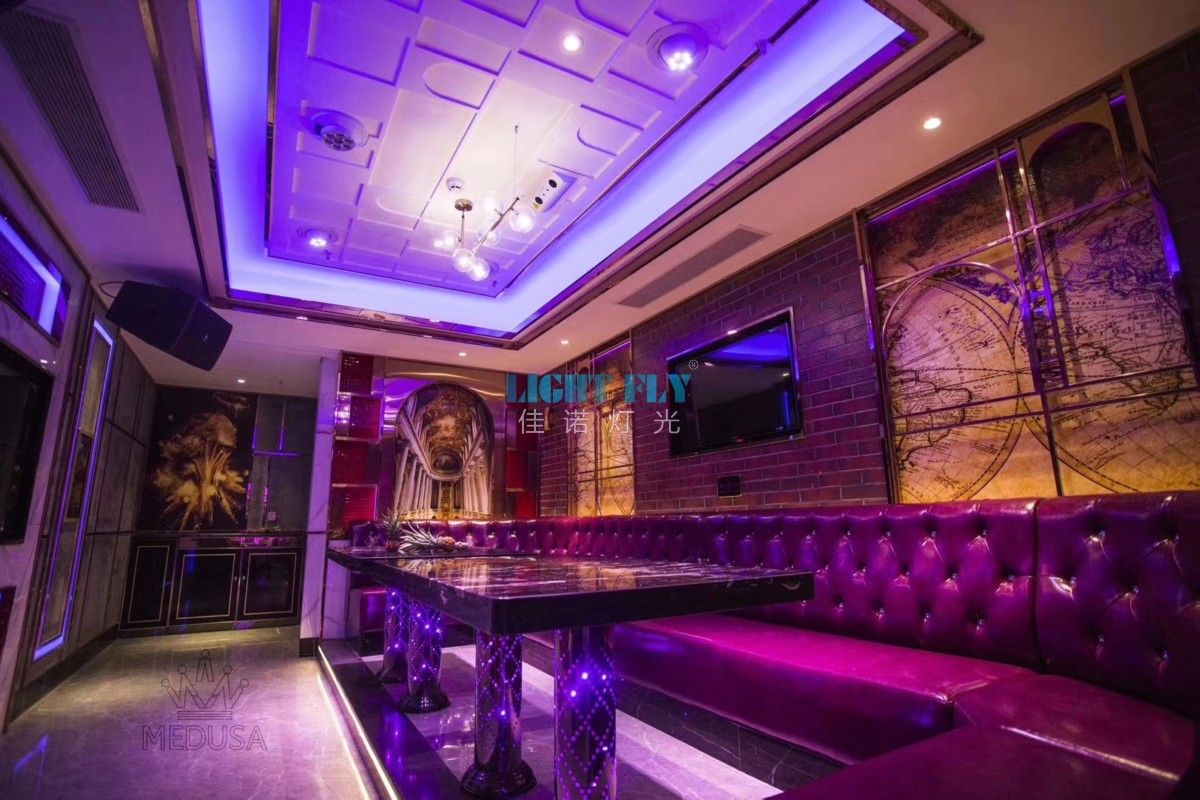 另外,還可將聲控彩色燈具裝飾在KTV內(nèi)天花板、窗沿等處,以增添舞池氣氛。或在舞池的地面裝上各種圖案的有機(jī)玻璃地板,地板下面裝上聲控彩燈,隨著音樂節(jié)奏的變化閃爍,效果很好。若空間可配合,還可裝上霓虹燈、鐳射彩燈等??傊?,KTV舞池?zé)艄怙L(fēng)格各異,應(yīng)根據(jù)KTV空間大小及功能需要來選擇,可典雅靜謐,可華麗熱烈。
