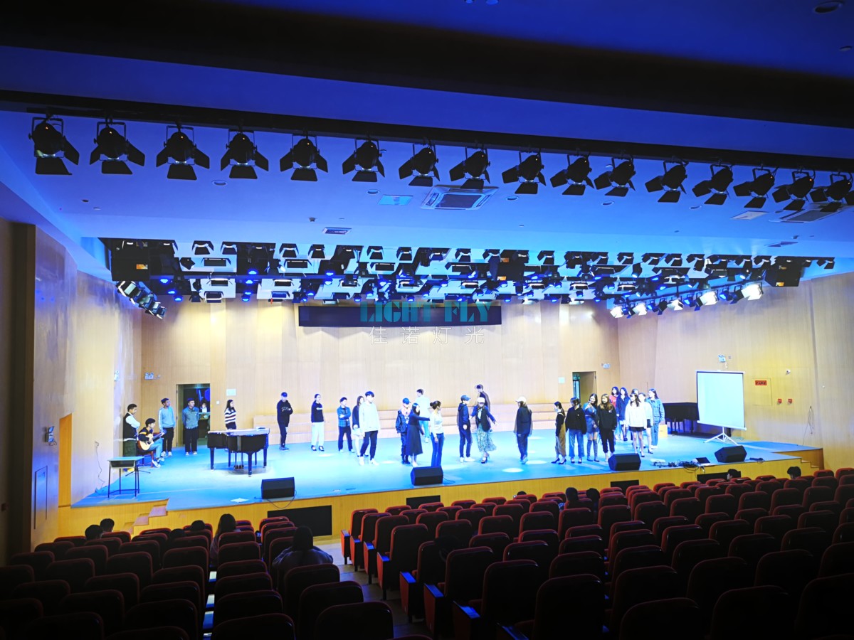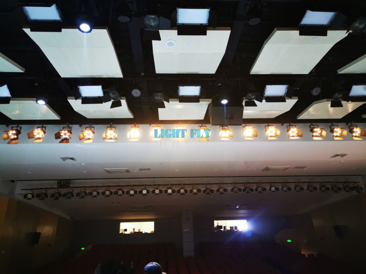 電腦燈主要布置在舞臺上空的頂光燈桿上,采用DMX信號連接電腦控制臺,可任意調(diào)整燈具投射角度,亮度,變換圖案,光束大小,色彩等功能,完全能滿足各種演出劇目對數(shù)字化電腦燈的變化要求。