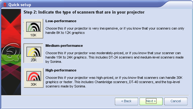 第2步(見下圖),選擇你的振鏡速度。QuickShow可用于任何類型的激光振鏡,對不同級別振鏡進行了優(yōu)化??v使你使用的是 8K 到 12K 振鏡,你也會發(fā)現(xiàn)Quickshow的非凡表現(xiàn)力。一個beta測試者說,"Quickshow令我的振鏡像新買來一樣,表現(xiàn)非常好!"