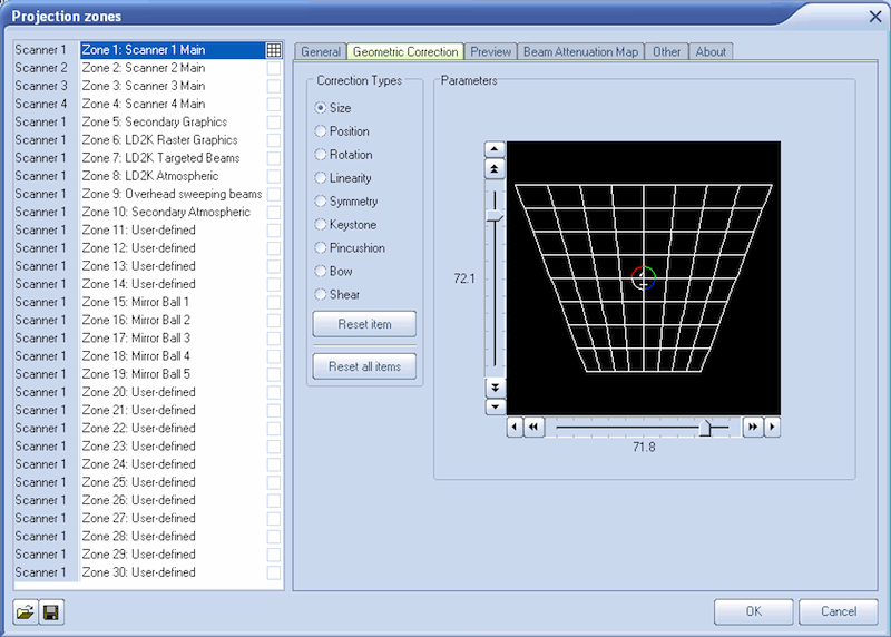 每個投影區(qū)域有各自的幾何校正選項,可以矯正離軸投影導(dǎo)致的圖像變形。每個區(qū)域還有一個“光束衰減分布圖”,可以定義掃描向觀眾的的激光區(qū)域的激光強度,確??煽?。高過人頭的光束功率可以滿載,同時射向人群的激光功率稍作削減。(注意:觀眾掃描需要相關(guān)激光可靠知識和措施,不要僅依賴光束衰減分布圖來確??煽?)