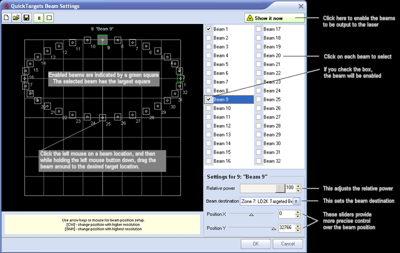 你可以定位到多大32個不同的反射鏡位置 (或者其他目標,如反射球或者光柵。)你只需拖放代表光束的方格到你想要的位置即可。同時你還可以設(shè)定光束的輸出功率,這樣你可以根據(jù)光束要射向的目標設(shè)定功率以確保可靠,如射向人的光束就設(shè)置暗一點。