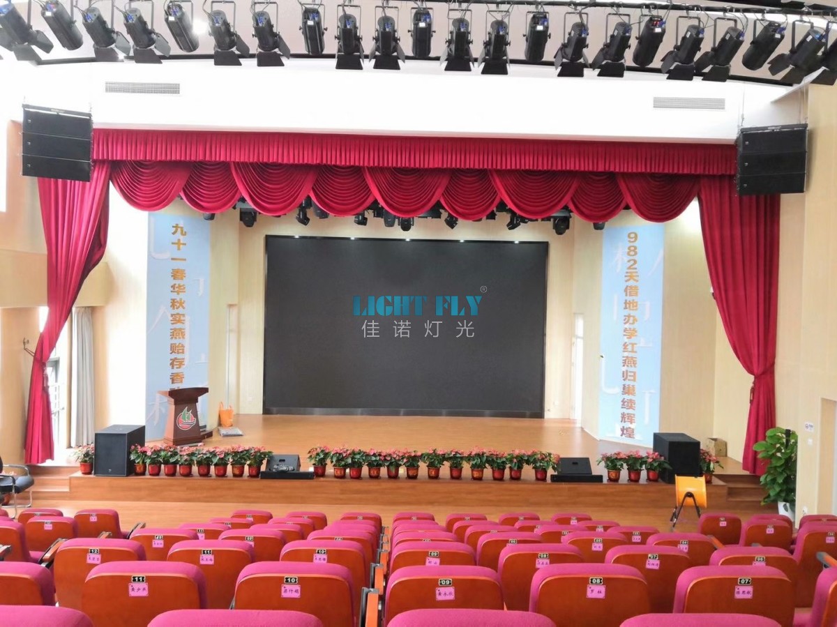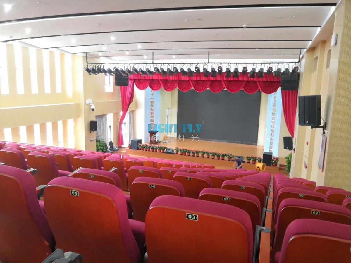 2020年東莞中心小學多功能會議室燈光進行升級改造,佳諾燈光LIGHT FLY按照最新的燈光系統(tǒng)方案,提供了設計,安裝,調(diào)試一體化服務。主要采用最新的26臺FLY-500T 200W調(diào)焦LED影視聚光燈,68臺FLY-1810L 18顆10W四合一LED染色燈,16臺FLY-380BSW 380W光束圖案燈,24臺FLY-380B 青龍款380W光束燈,一臺八路觸摸老虎控臺等燈光控制臺設備,高亮度的會議廳效果得到校領導的一致好評,廣州佳諾燈光設備有限公司是一家十二年從事智能化演藝燈光研發(fā)、生產(chǎn)、銷售、服務于一體的國家高新技術企業(yè)。其自主品牌【佳諾燈光LIGHT FLY】產(chǎn)品涵蓋專業(yè)舞臺燈光、LED演藝照明,文旅亮化等領域,廣泛應用于劇院、體育場館、電視臺及各種演出場所。