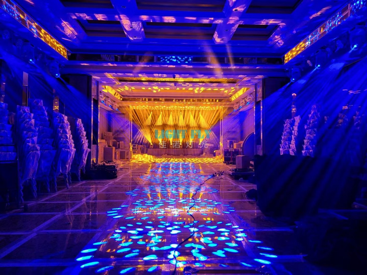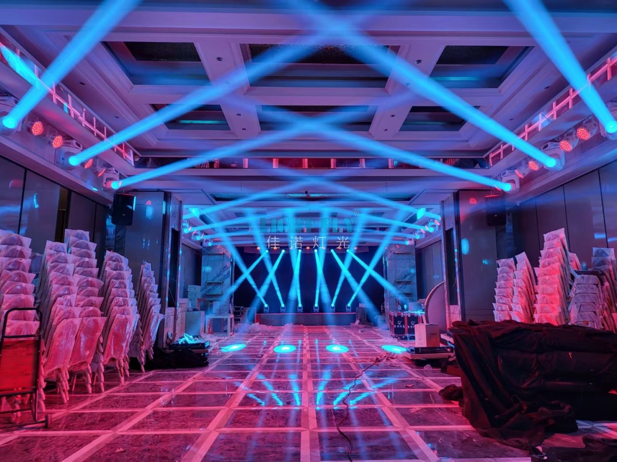 廣成大酒店2022年迎來5個(gè)宴會(huì)廳燈光重新裝修與設(shè)計(jì)。整個(gè)酒店宴會(huì)廳整體裝修高檔典雅、時(shí)尚華貴,將“崆峒文化”和“廣成文化”的厚重、包容與現(xiàn)代化大都市的開放、科學(xué)有機(jī)結(jié)合。酒店共設(shè)六大功能區(qū)域:大堂接待區(qū)寬敞大氣,大堂吧配有緩流水景、精品玉器店、名優(yōu)特產(chǎn)專賣店、廣成畫廊,滿足不同賓客的購(gòu)物休閑需求。舞臺(tái)與大廳設(shè)計(jì)全部由佳諾燈光LIGHT FLY設(shè)計(jì)師完成。采用了酒店宴會(huì)廳常用的380W光束與18顆10W四合一LED染色帕燈,四眼LED面光燈,薄霧油煙霧機(jī),燈光控制臺(tái)燈等舞臺(tái)燈設(shè)備。符合了現(xiàn)代化宴會(huì)廳燈光秀效果。